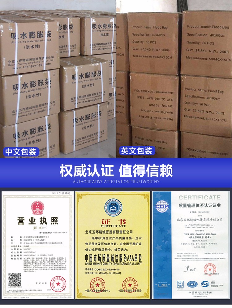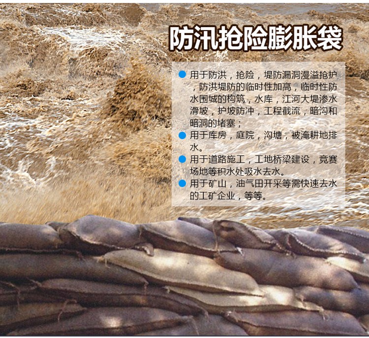 用于防汛堤壩的臨時加高、防水圍墻的構(gòu)筑、放坡防沖、水庫的管涌可暗洞的堵塞;還可用于庭院、溝塘、耕地農(nóng)田、地鐵、隧道、礦井、學(xué)校、銀行等處的擋水和排水